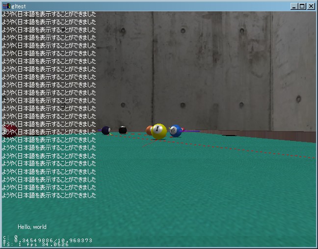 この関数はwchar_t型の配列を引数に取るので、呼び出し時には文字列定数に L を付加してやるか、 mbtowc などの関数で変換してやる必要がある(テストはしていない)。draw_text(L"ようやく日本語を表示することができました"); ポイントは GetCharacterPlacementW によって文字幅を取得しているところ。文字幅が可変なフォントは多いが、これまた多バイト文字への対応が困ったもので、 GetCharacterWidth32 という、より尤もらしい関数は Windows 98 以前では使えないし、日本語は使えない。 1文字ずつ文字幅を取得しているのでカーニングは考慮されていないが、まあこの程度の用途なら問題ないだろう。 最後の注意になるが、この方法による描画は毎回 glBitmap を使っているため、非常に遅い。特に高速なグラフィック・ハードウェアを装備している環境では遅さが目立つ。ボトルネックは、メインメモリからビデオメモリへのビットマップの転送にある。ただ、膨大な数の漢字を全てビデオメモリにキャッシュするというのも美しくない。使用されているグリフのみをキャッシュするような仕組みを作れば高速化が期待できる。 [追記] フレームごとに上記の draw_text の最初の出力に ASCII 文字を指定しないと、文字列を描画する領域全体が塗りつぶされてしまうことがあるようだ。なぜだろう?? PR